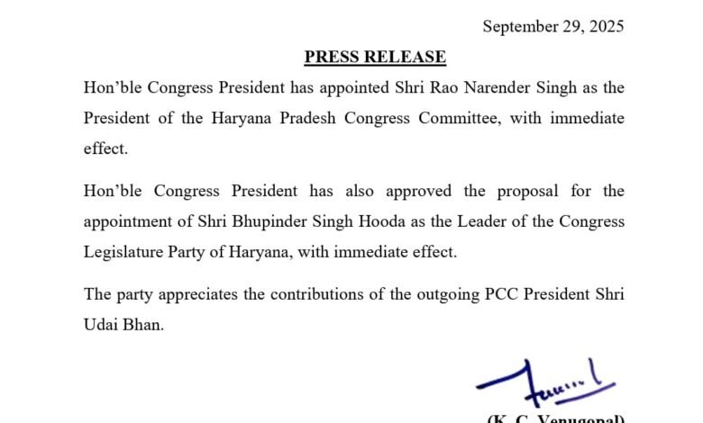 अखिल भारतीय कांग्रेस कमेटी ने एक महत्वपूर्ण फैसला लेते हुए हरियाणा के पूर्व मंत्री राव नरेंद्र सिंह को हरियाणा प्रदेश कांग्रेस कमेटी का अध्यक्ष नियुक्त किया है। पार्टी ने हरियाणा के पूर्व मुख्यमंत्री भूपेंद्र सिंह हुड्डा को फिर से विधायक दल के रूप में स्वीकार किया है। पार्टी के यह आदेश तत्काल प्रभाव से लागू हो गए हैं।