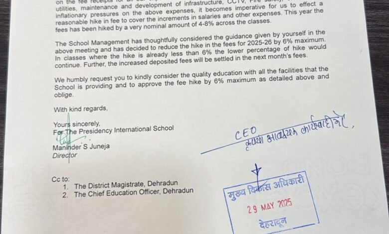 जिला प्रशासन के कड़े रूख और निरंतर प्रवर्तन की कार्यवाही से जहंा निजी नामी गिरामी स्कूलों के तेवर ढीले हो गए हैं, वहीं स्कूल प्रबन्धन अब अपनी फीस घटा रहे। ताजा मामला द प्रेसिडेंसी इन्टरनेशनल स्कूल भानियावाला का है, स्कूल प्रबन्धन द्वारा लिखित रूप से स्कूल फीस कम करने का पत्र प्रशासन को दिया है। जिला प्रशासन की दृढ़ इच्छा शक्ति के आगे अब शिक्षा माफियाओं के हौसले नहीं टिक पा रहे हैं, जिससे जिले के कई नामी गिरामी स्कूल अब मनमर्जी फीस बढोतरी पर आए बैकफुट पर आएं है। जिला प्रशासन ने जैसे ही सख्ताई दिखाई तो धीरे-2 स्कूल फीस बढोतरी का खेल भी खुलने लगा। द प्रसिडेंसी इन्टरनेशनल स्कूल, भनियावाला का मामला सामने आया है जहां 100 से अधिक अभिभावकों ने फीस बढ़ोतरी की थी शिकायत, बिना मान्यता नवीनीकरण के स्कूल संचालित होने पर प्रशासन ने लगाई रू0 5,20,000 शास्ति लगाई थी। अब स्कूल प्रबन्धन द्वारा जिला प्रशासन को लिखित रूप फीस कम करने का पत्र दिया है।