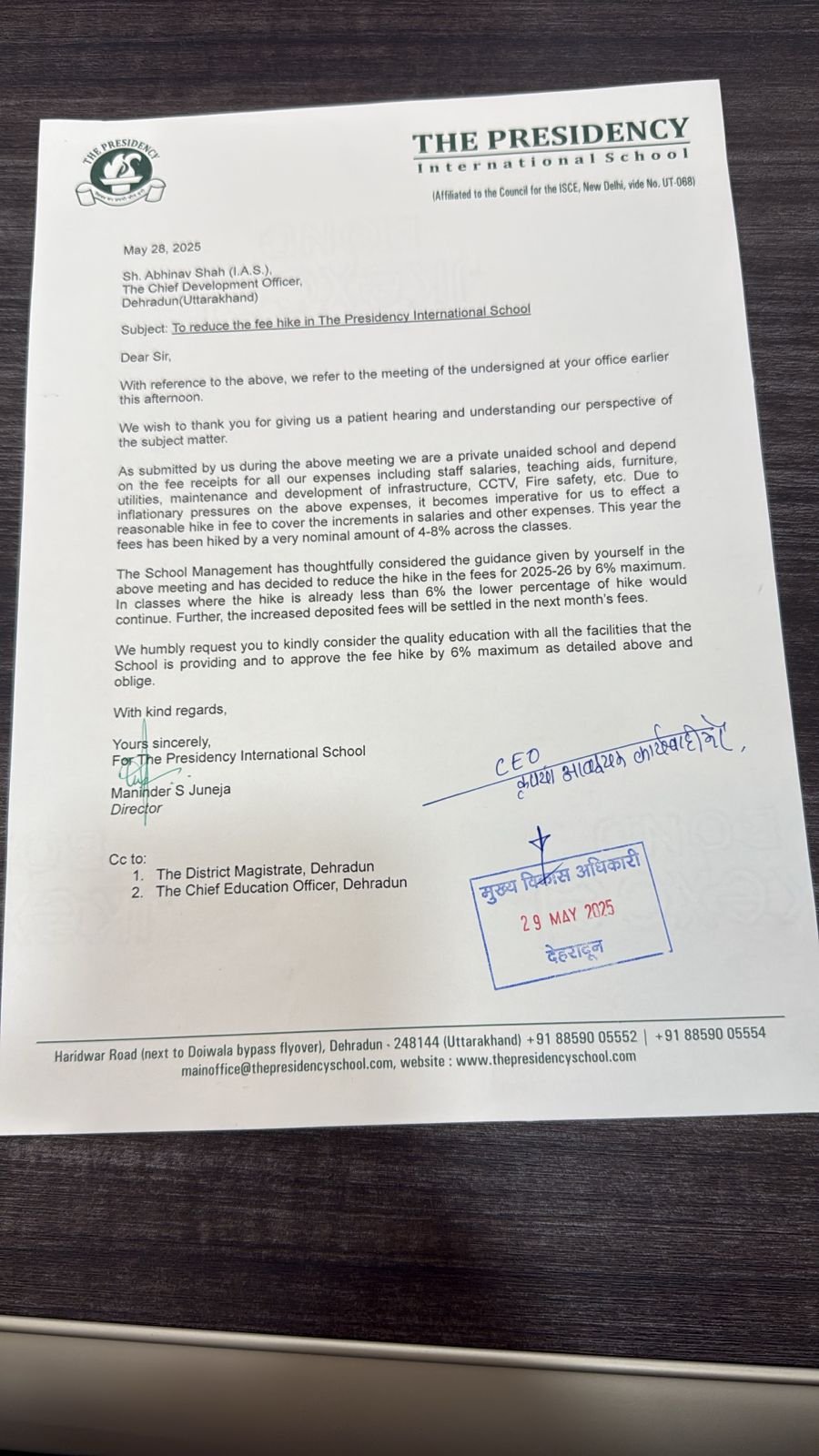 द प्रसिडेंसी इन्टरनेशनल स्कूल, भनियावाला का लिखित रूप से फीस कम करने का जिला प्रशासन को पत्र