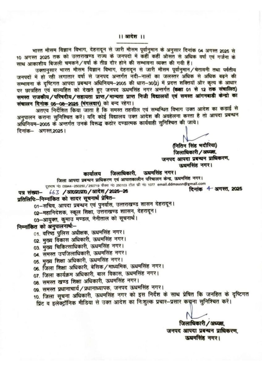 भारत मौसम विज्ञान विभाग, देहरादून एवं एन०डी०एम०ए० के सचेत, National Disaster Alert Portal द्वारा 04 अगस्त, 2025 को जारी अद्यतन मौसम पूर्वानुमान के अनुसार 05 अगस्त, 2025 को जनपद देहरादून में कहीं-कहीं भारी से अत्यंत भारी वर्षा कुछ जगहों पर भारी से बहुत भारी वर्षा कहीं-कहीं गर्जन के साथ आकाशीय बिजली चमकने/वर्षा के अति तीव्र दौर का “औरेंज’ अलर्ट जारी किया गया है। वर्तमान में जनपद के समस्त क्षेत्रों में मध्यम से भारी वर्षा के दृष्टिगत संवेदनशील स्थलों में भूस्खलन / त्वरित बाढ़ की सम्भावना बढ़ जाती है। जिससे किसी भी प्रकार की अप्रिय घटना घटित हो सकती है। आपदा न्यूनीकरण के दृष्टिगत जनपद के कक्षा 01 से 12 तक संचालित समस्त शैक्षणिक संस्थाओं और आंगनबाडी केन्द्रों में 05.08.2025 को एक दिन का अवकाश घोषित किया जाता है।