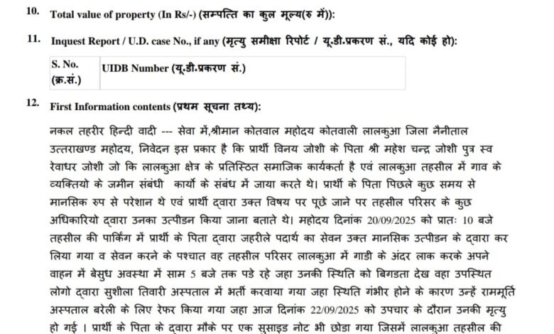 लालकुआं पुलिस ने पटवारी पुजा रानी के खिलाफ बीएनएस (भारतीय न्याय संहिता) की धारा 108 के तहत किया मुकदमा दर्ज, मृतक महेश जोशी के पुत्र विनय जोशी की तहरीर पर किया मुकदमा दर्ज।