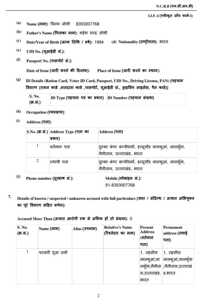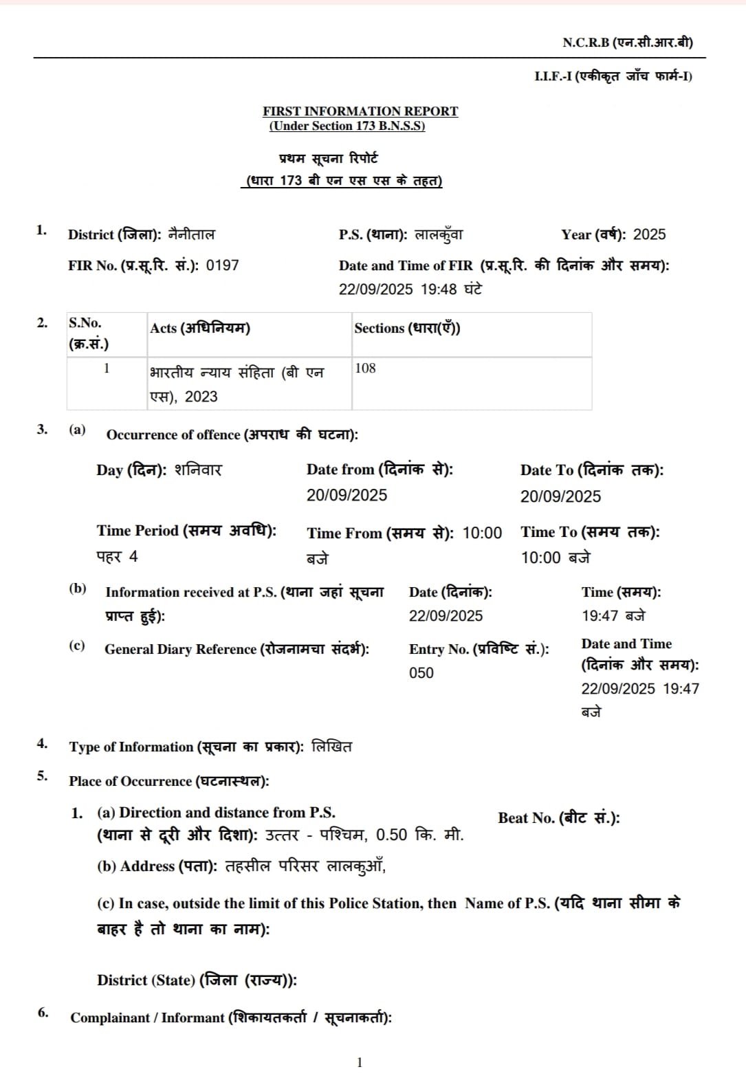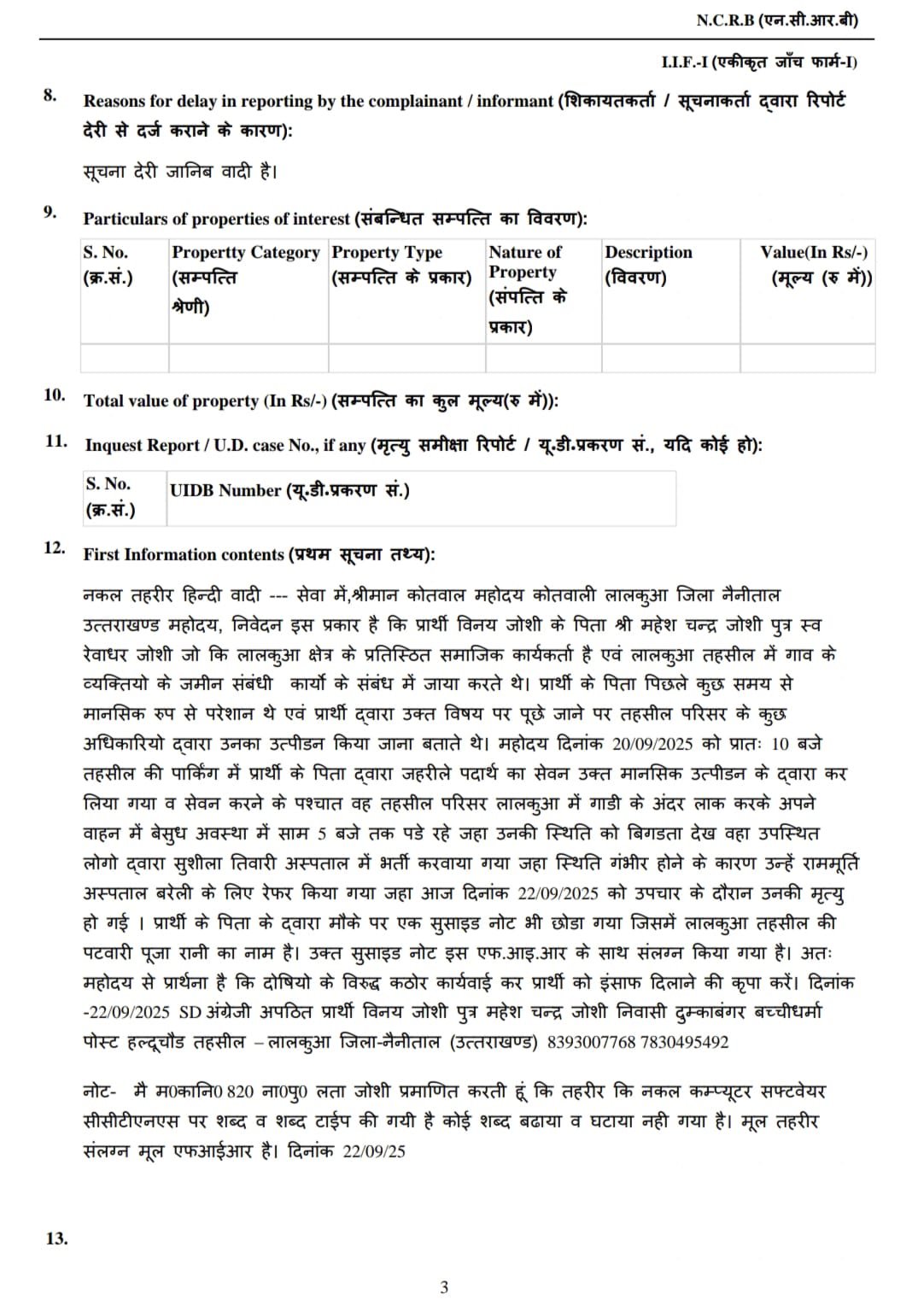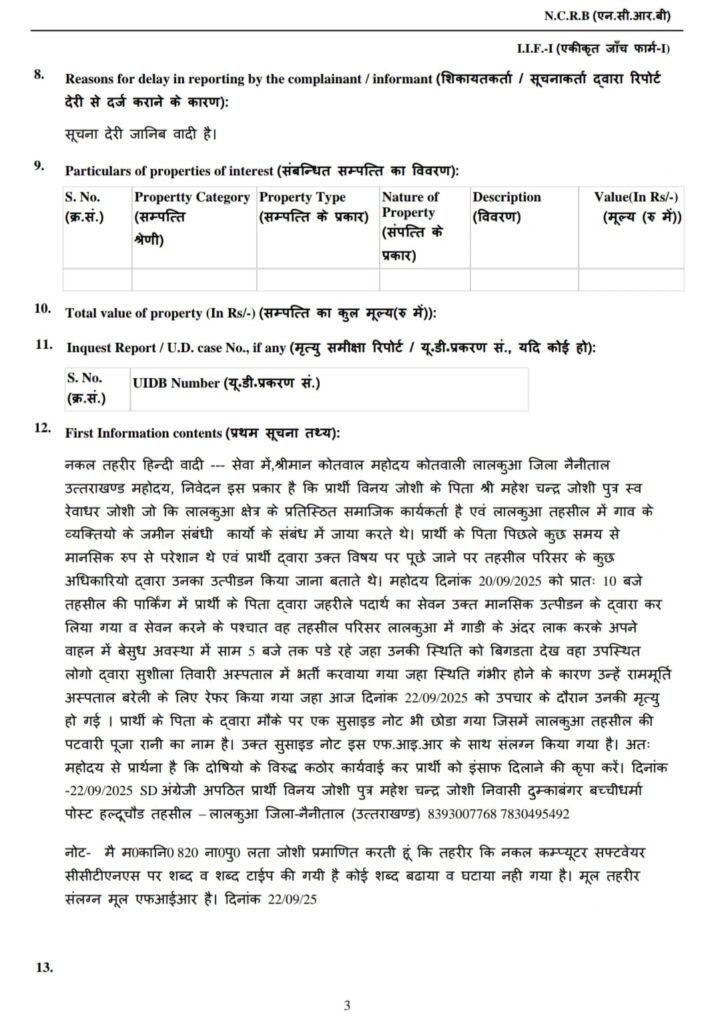 लालकुआं पुलिस ने पटवारी पुजा रानी के खिलाफ बीएनएस (भारतीय न्याय संहिता) की धारा 108 के तहत किया मुकदमा दर्ज, मृतक महेश जोशी के पुत्र विनय जोशी की तहरीर पर किया मुकदमा दर्ज।