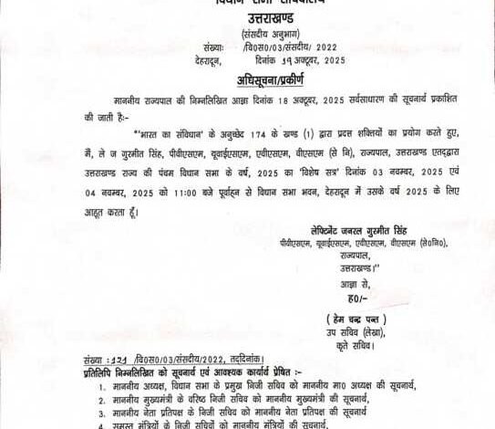 राज्यपाल ने भारत के संविधान के अनुच्छेद 174(1) के तहत प्रदत्त शक्तियों का प्रयोग करते हुए यह आदेश जारी किया है। अधिसूचना के अनुसार, विशेष सत्र का आयोजन 3 नवम्बर और 4 नवम्बर को प्रातः 11:00 बजे से देहरादून स्थित विधानसभा भवन में किया जाएगा।