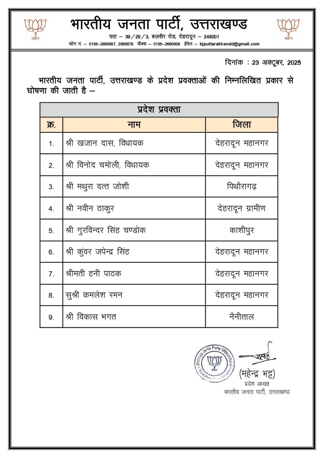 देहरादून। भाजपा ने प्रदेश प्रवक्ताओं की घोषणा कर दी है।