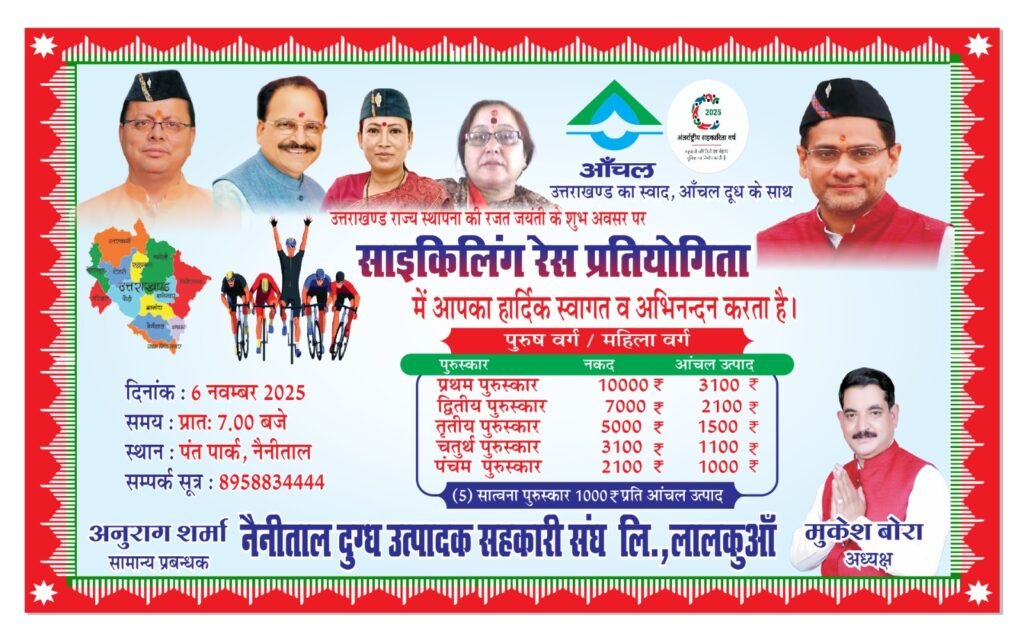 नैनीताल आँचल दुग्ध उत्पादक सहकारी संघ लिमिटेड द्वारा आयोजित स्थापना दिवस रजत जयंती समारोह के अंतर्गत नैनीताल में 25 किलोमीटर साइकिलिंग रेस प्रतियोगिता का आयोजन किया जाएगा।