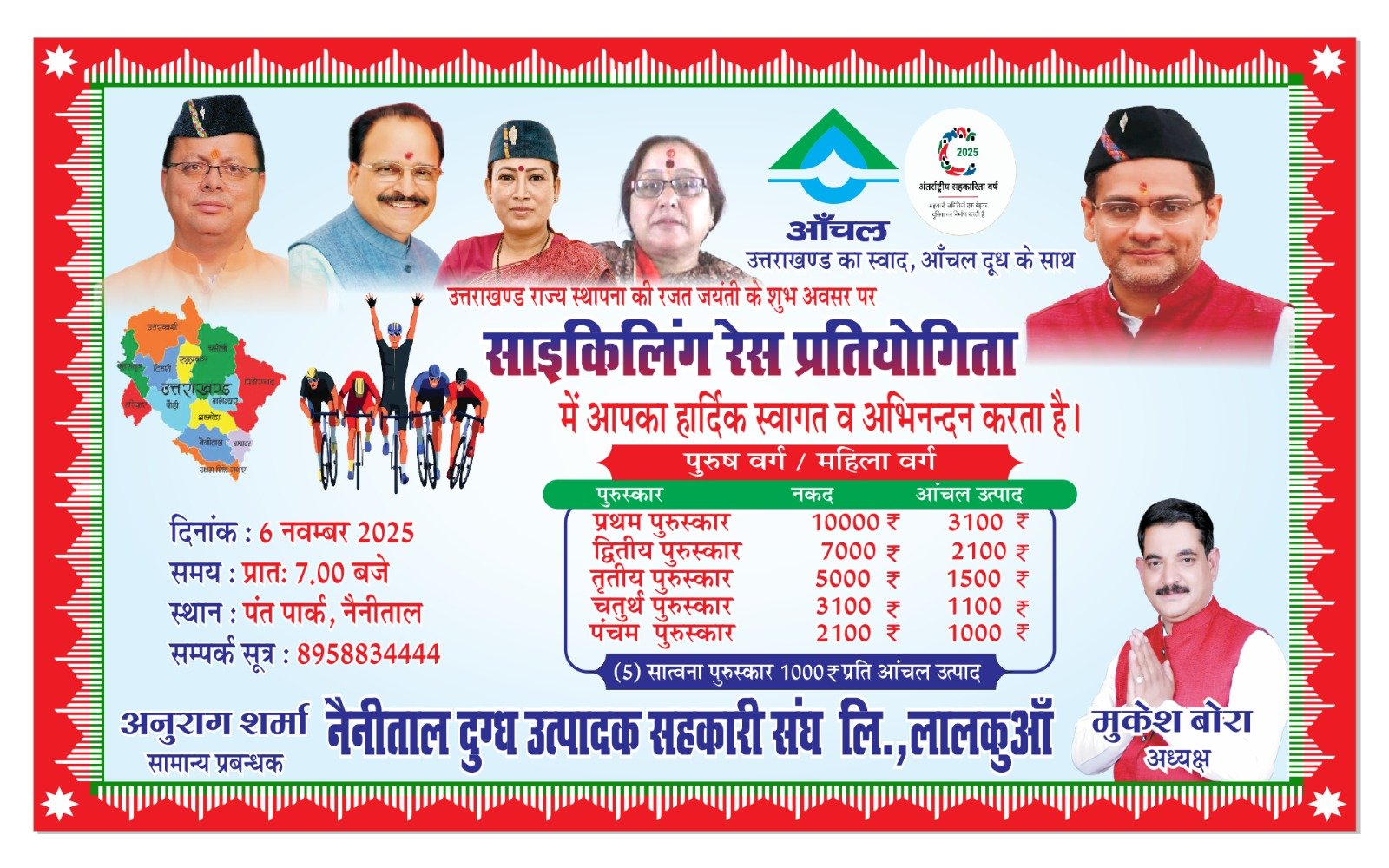 नैनीताल आँचल दुग्ध उत्पादक सहकारी संघ लिमिटेड द्वारा आयोजित स्थापना दिवस रजत जयंती समारोह के अंतर्गत नैनीताल में 25 किलोमीटर साइकिलिंग रेस प्रतियोगिता का आयोजन किया जाएगा।