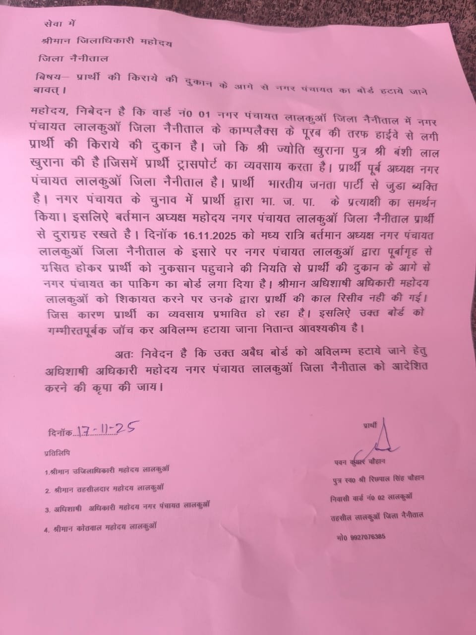 नगर पंचायत लालकुआं में राजनीतिक तनाव एक बार फिर सतह पर आ गया है। पूर्व चेयरमैन एवं वरिष्ठ भाजपा नेता पवन चौहान ने वर्तमान चेयरमैन सुरेंद्र लोटनी पर भेदभावपूर्ण रवैया अपनाने का गंभीर आरोप लगाया है।