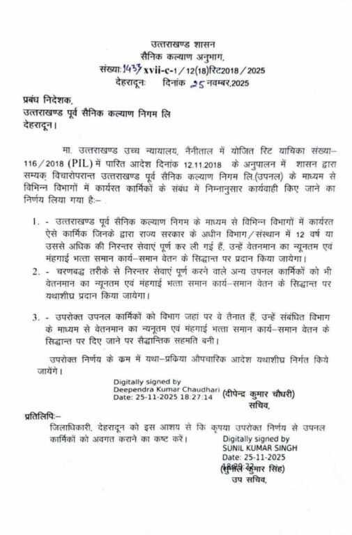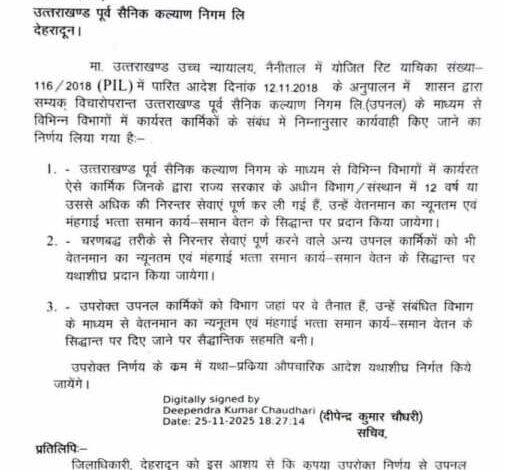 उत्तराखंड सरकार ने उत्तराखंड पूर्व सैनिक कल्याण निगम लिमिटेड (UPNL) के कर्मचारियों के लिए एक बड़ा फैसला लिया है।