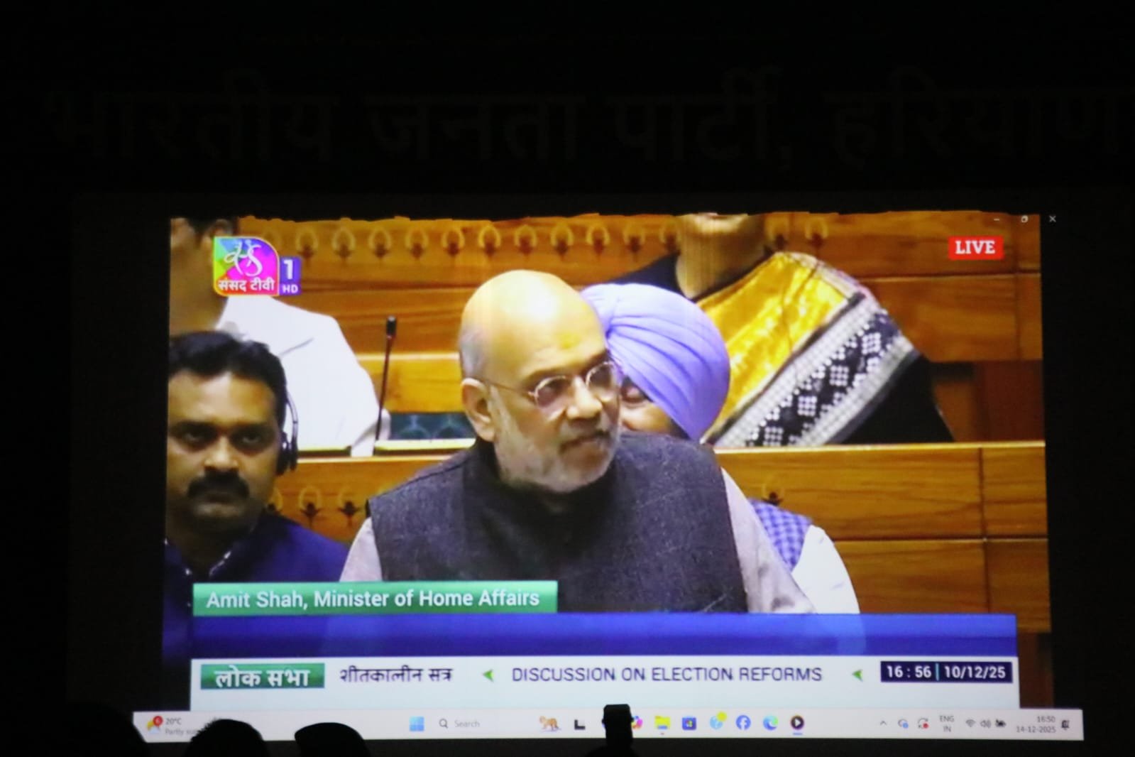 मुख्यमंत्री नायब सैनी ने कांग्रेस नेताओं को बड़ी स्क्रीन लगाकर केंद्रीय गृहमंत्री अमित शाह का संसद में दिए गए भाषण को सुनने की सलाह दी