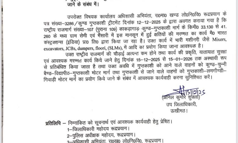राष्ट्रीय राजमार्ग संख्या–107 (पुराना 109) के काकड़ागाड़–कुण्ड–गुप्तकाशी मार्ग पर मानसून के दौरान हुई क्षतियों की मरम्मत एवं सुदृढ़ीकरण कार्य के दृष्टिगत उक्त मार्ग को अस्थायी रूप से बंद किए जाने की अनुमति प्रदान की गई है। यह जानकारी उप जिलाधिकारी ऊखीमठ अनिल कुमार शुक्ला द्वारा दी गई।