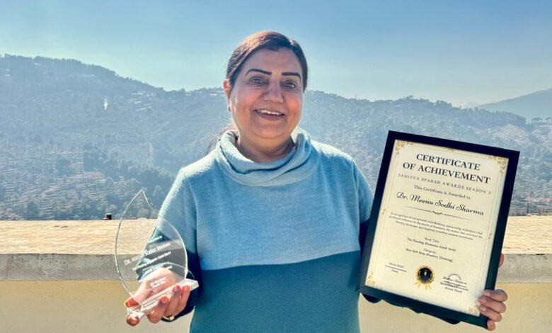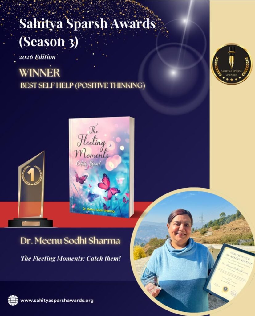 हरिद्वार के उपनगर कनखल की निवासिनी लेखिका डॉ. मीनू सोढ़ी शर्मा को उनकी पुस्तक “द फ्लीटिंग मोमेंट्स: कैच देम।” के लिए सर्वश्रेष्ठ स्वसहायता श्रेणी में प्रतिष्ठित साहित्य स्पर्श पुरस्कार से सम्मानित किया गया है।