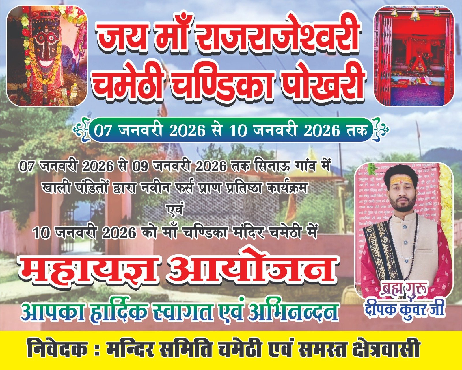 आपको बता दें कि केदार खंड क्षेत्राधिपति बाबा अष्टभैरवनाथ मंदिर के मठाधीश एंव प्रसिद्ध चंडिका ब्रह्मगुरु ज्योतिषाचार्य कुंवर दीपक सिंह ने बताया कि उनके द्वारा चमेठी चंडिका पखोरी में 7 जनवरी 2026 से 09 जनवरी 2026 तक सिनाऊ गांव में खाली पंडितों द्वारा नवीन फर्स प्राण प्रतिष्ठा कार्यक्रम किया जाएगा