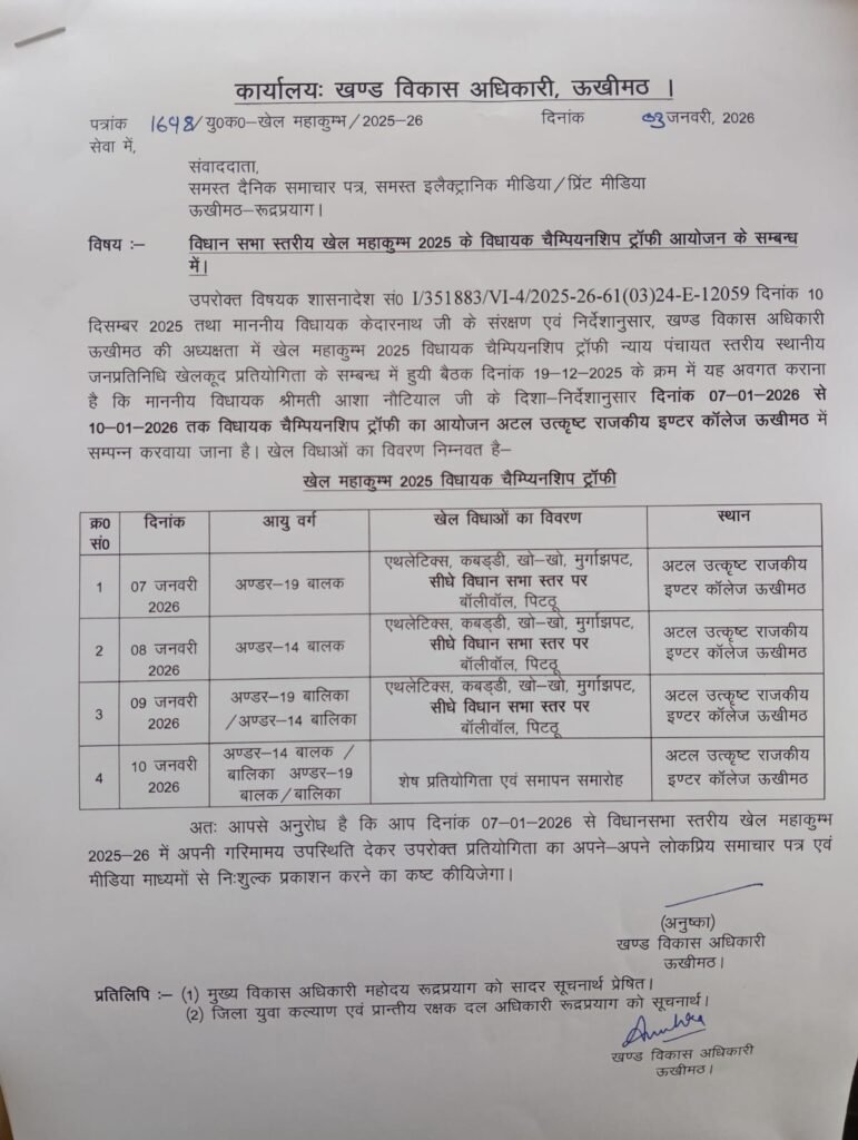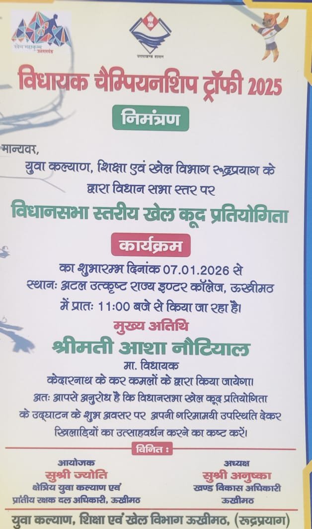 वहीं खण्ड विकास अधिकारी ऊखीमठ अनुष्का ने बताया कि विधानसभा स्तरीय खेल महाकुंभ 2025 के विधायक चैम्पियनशिप ट्राफी का शुभारंभ 7 जनवरी 2026 से अटल उत्कृष्ट राजकीय इण्टर कालेज ऊखीमठ के मैदान किया जाएगा।