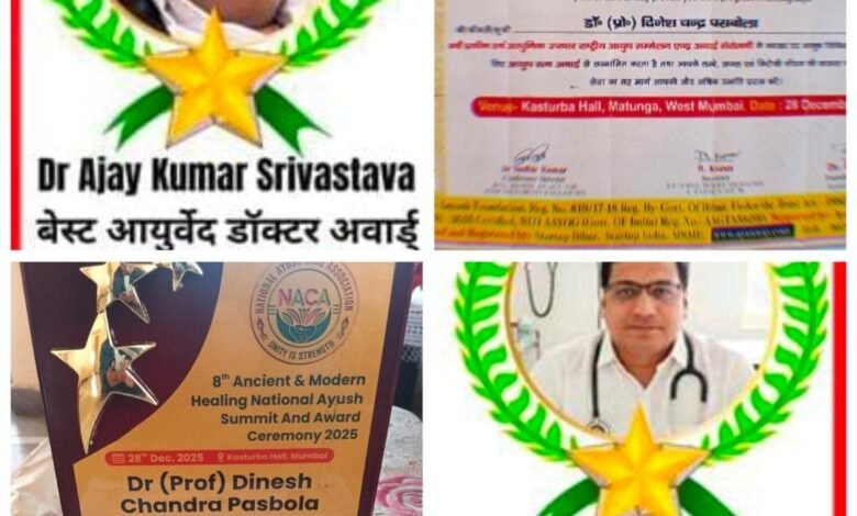 डॉ० अजय कुमार श्रीवास्तव को मिला “बेस्ट आयुर्वेद चिकित्सक सम्मान”।