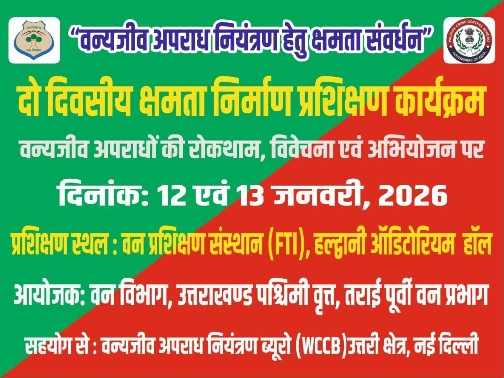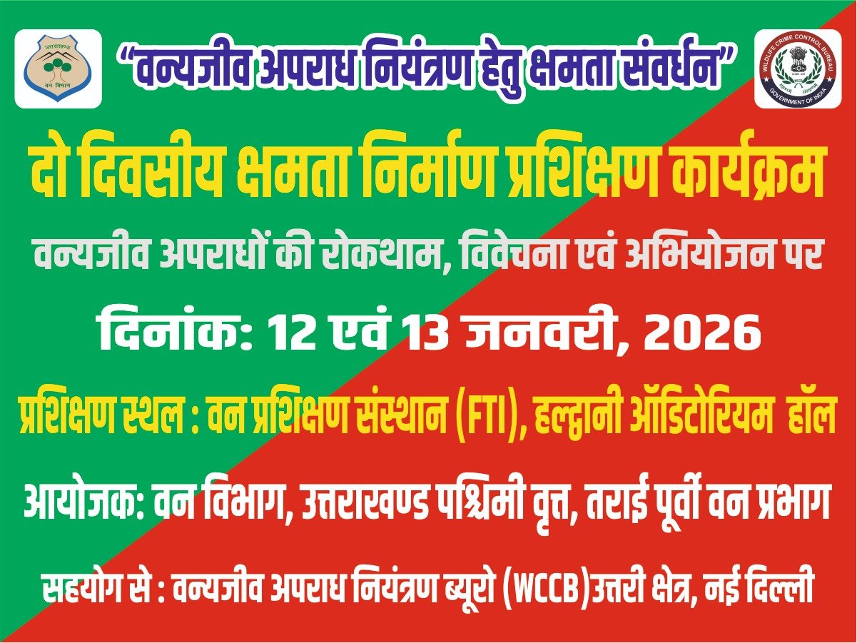 उत्तराखंड वन विभाग एवं वन्यजीव अपराध नियंत्रण ब्यूरो (WCCB) के संयुक्त तत्वावधान में वन्यजीव अपराध नियंत्रण विषय पर आधारित दो दिवसीय क्षमता संवर्धन प्रशिक्षण कार्यक्रम का आयोजन 12 एवं 13 जनवरी, 2026 को FTI, हल्द्वानी के सभागार में किया जा रहा है।