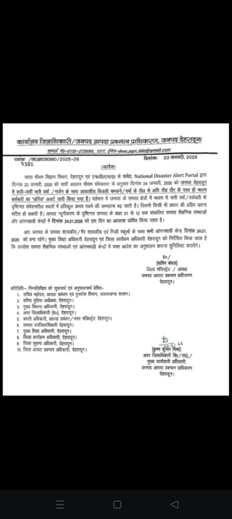 अतः जनपद के समस्त शासकीय / गैर शासकीय एवं निजी स्कूलों के साथ सभी आंगनबाडी केन्द्र दिनांक 24.01. 2026 को बन्द रहेंगे। मुख्य शिक्षा अधिकारी देहरादून एवं जिला कार्यक्रम अधिकारी देहरादून को निर्देशित किया जाता है कि उपरोक्त समस्त शैक्षणिक संस्थाओं एवं आंगनबाड़ी केन्द्रों में उक्त आदेश का अनुपालन कराना सुनिश्चित करायेंगे।