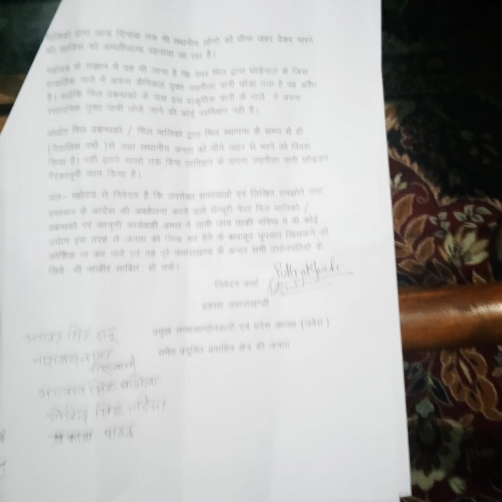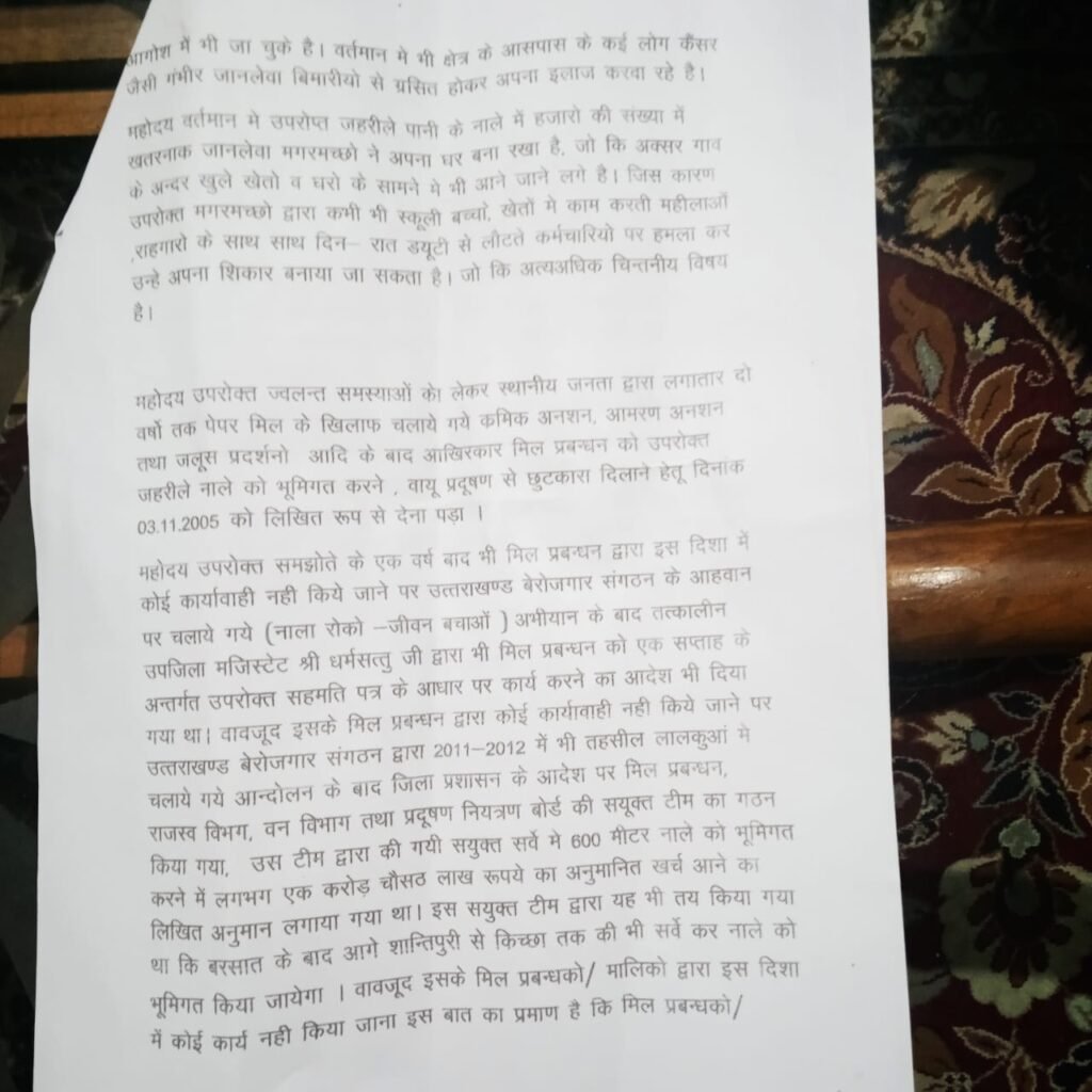 बताते चले कि यहाँ उत्तराखण्ड बेरोजगार संगठन के प्रदेश अध्यक्ष एवं राज्य आंदोलनकारी प्रकाश उत्तराखण्डी के नेतृत्व में हुई महापंचायत में वक्ताओं ने कहा कि सेंचुरी पेपर मिल द्वारा छोड़े गए जहरीले नाले में अब हर आकार के मगरमच्छ पनप चुके हैं, जिससे स्कूल जाने वाले बच्चों, घास लाने वाली महिलाओं और राहगीरों की जान-माल को गंभीर खतरा पैदा हो गया है। यह नाला गांव के बीचों-बीच रिहायशी इलाकों से होकर बह रहा है, जिससे जल प्रदूषण के साथ-साथ जमीन के भीतर कई सौ फीट तक का पानी भी जहरीला हो चुका है।