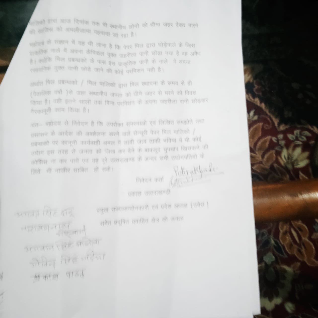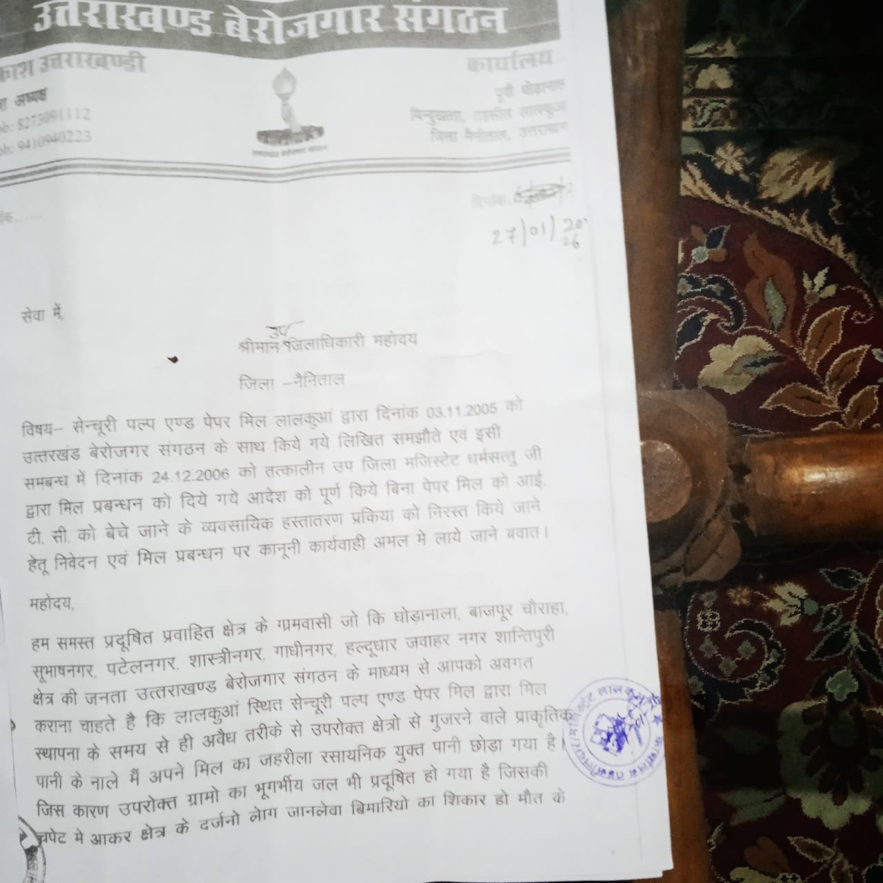 वही दिये गए ज्ञापन में वर्ष 2006 में जिला प्रशासन द्वारा सेंचुरी पेपर मिल प्रबंधन को दिए गए आदेशों का पालन करवाने, जहरीले नाले को भूमिगत करने तथा उसमें पल रहे विशालकाय मगरमच्छों के आतंक से क्षेत्रवासियों को सुरक्षा दिलाने की मांग की गई है। साथ ही प्रदूषण से प्रभावित स्थानीय युवाओं को रोजगार में प्राथमिकता देने की भी मांग उठाई गई।