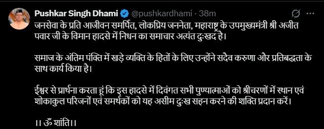सीएम धामी ने कहा कि ‘जनसेवा के प्रति आजीवन समर्पित, लोकप्रिय जननेता, महाराष्ट्र के उपमुख्यमंत्री अजीत पवार के विमान हादसे में निधन का समाचार अत्यंत दुःखद है। समाज के अंतिम पंक्ति में खड़े व्यक्ति के हितों के लिए उन्होंने सदैव करुणा और प्रतिबद्धता के साथ कार्य किया है।