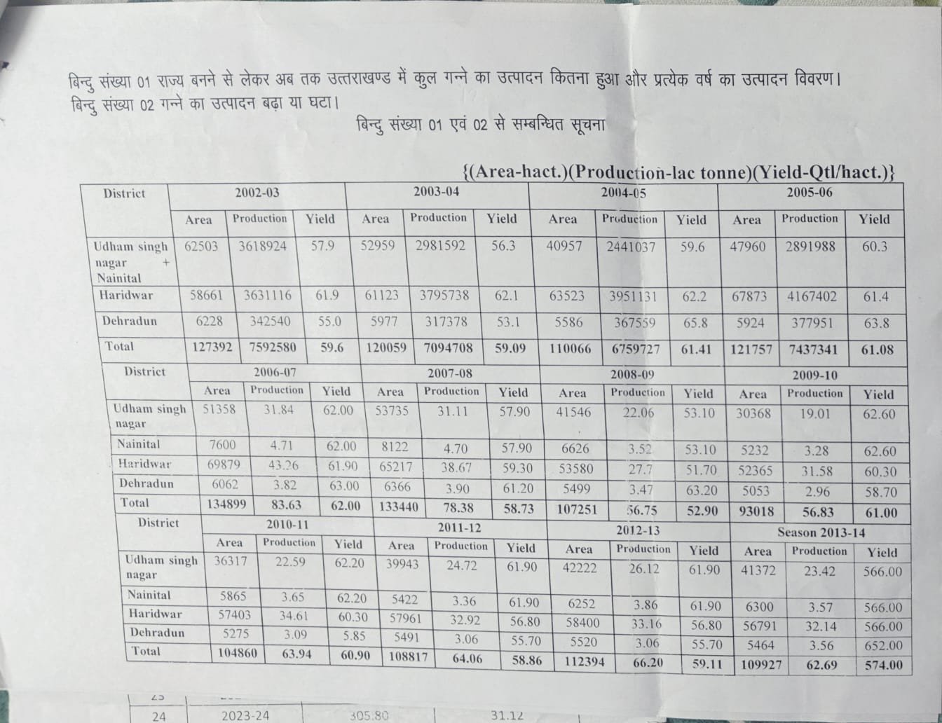 वर्ष 2023-24 में अचानक गिरावट आई और गन्ना 305.80 लाख कुंतल तथा चीनी 31.12 लाख कुंतल रह गई।