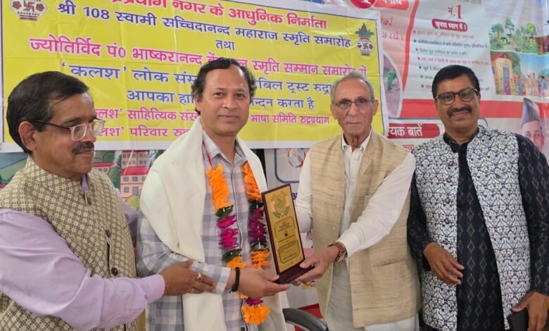 रुद्रप्रयाग। ‘कलश’ लोक संस्कृति चैरिटेबल ट्रस्ट रुद्रप्रयाग द्वारा नगर पालिका परिषद सभागार में आयोजित श्री 108 स्वामी सच्चिदानन्द स्मृति समारोह-2026 के अवसर पर ज्योतिर्विद पंडित भास्करानन्द बेंजवाल स्मृति सम्मान-2026 से सुप्रसिद्ध रंगकर्मी एवं समाजसेवी श्री लखपत सिंह राणा को सम्मानित किया गया। यह सम्मान केदारघाटी में आधुनिक शिक्षा के क्षेत्र में उनके बहुमूल्य योगदान के लिए प्रदान किया गया।